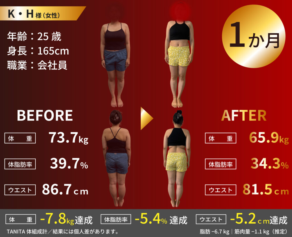 結果として、ウエスト-16cm・体脂肪-14.7%と大きな改善を達成。