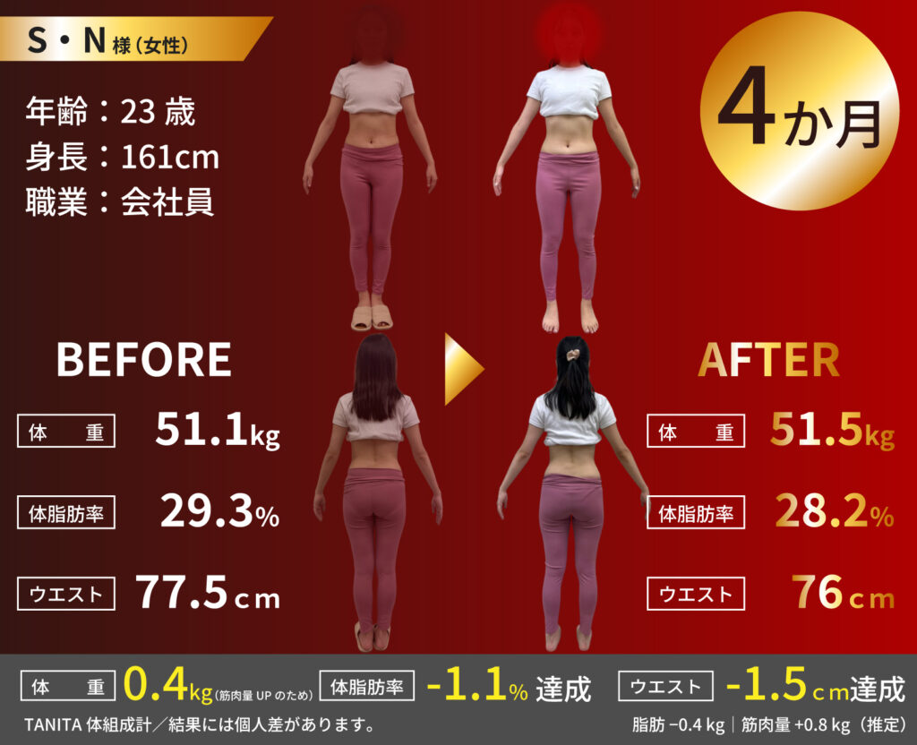 そのうえで、女性でも無理なく続けられる筋トレを段階的に実施し、むくみが減少。脂肪がしっかり落ちて、ウエスト-5.2cmという大きな変化につながりました。