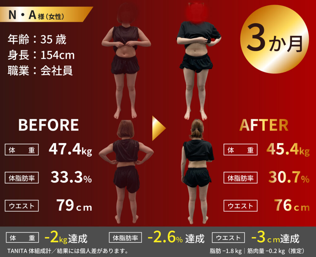 下腹・腰まわりが引き締まり、3か月で着実な変化を達成。在宅勤務で体型が崩れやすい方に参考になる好事例です。